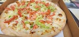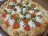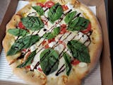 White pizza, tomatoes, fresh mozzarella, basil and balsamic drizzle.